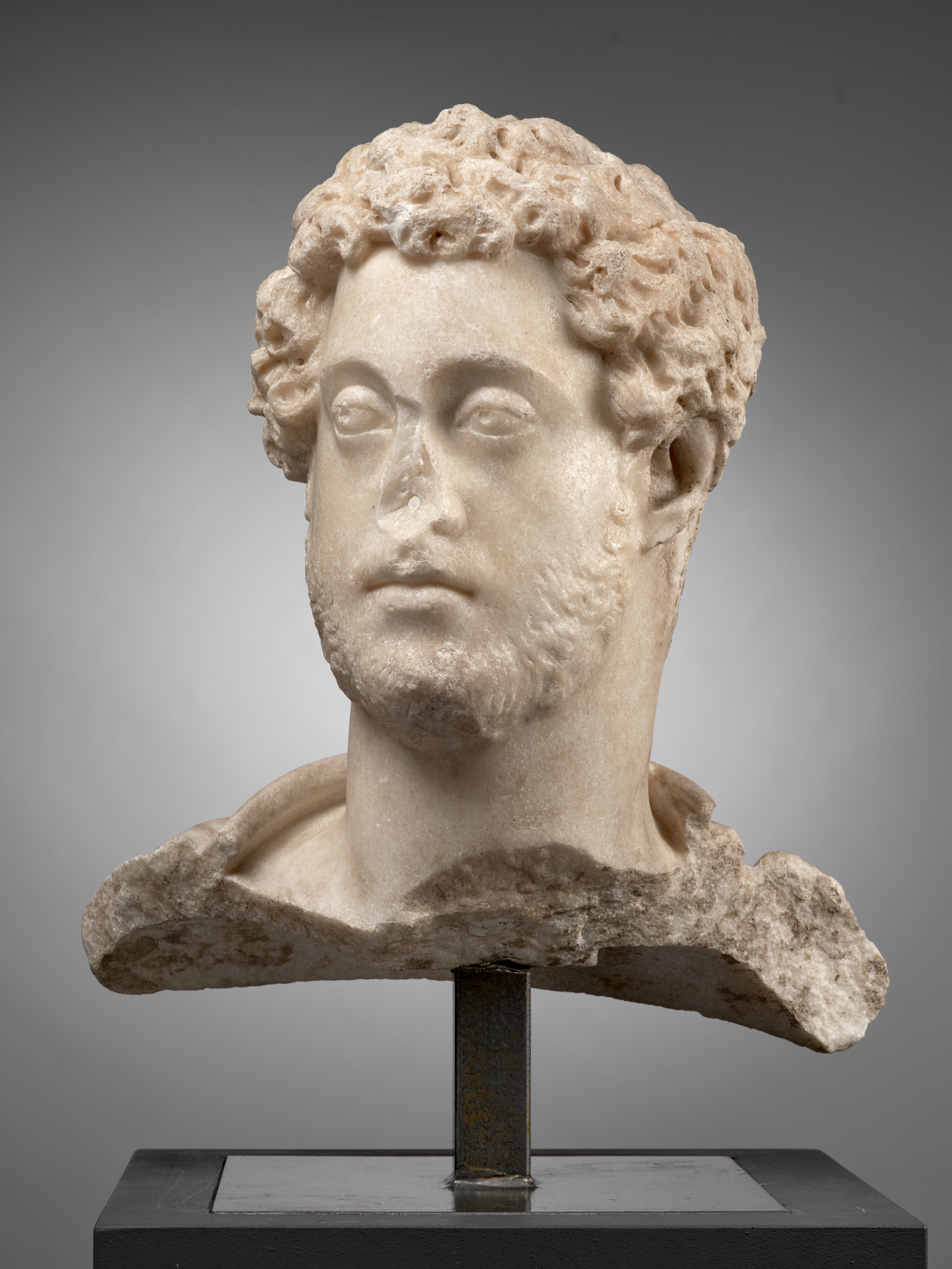 Le sinistre empereur Commode, fils de Marc Aurèle et de Faustine la Jeune, fut le dernier représentant de la dynastie des Antonins. Il naquit dans la villa familiale, située au sud de Rome, dans les monts Albains, à Lanuvium. Petit-fils d’Antonin le Pieux, il passa son enfance à la cour et fut associé par son père à l’Empire alors qu’il n’avait que seize ans. Son règne personnel dura douze ans et demi, une période durant laquelle les types iconographiques de cet empereur, fasciné par la gladiature, furent nombreux. On dénombre en effet huit voire neuf types : trois de l’enfance et cinq ou six de l’âge adulte.