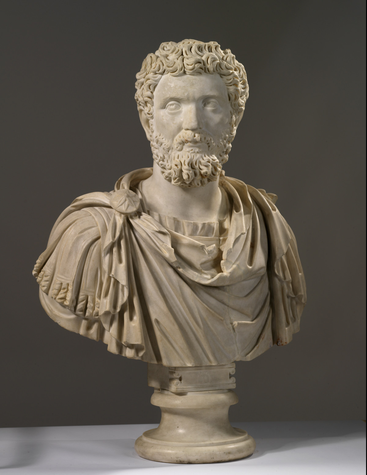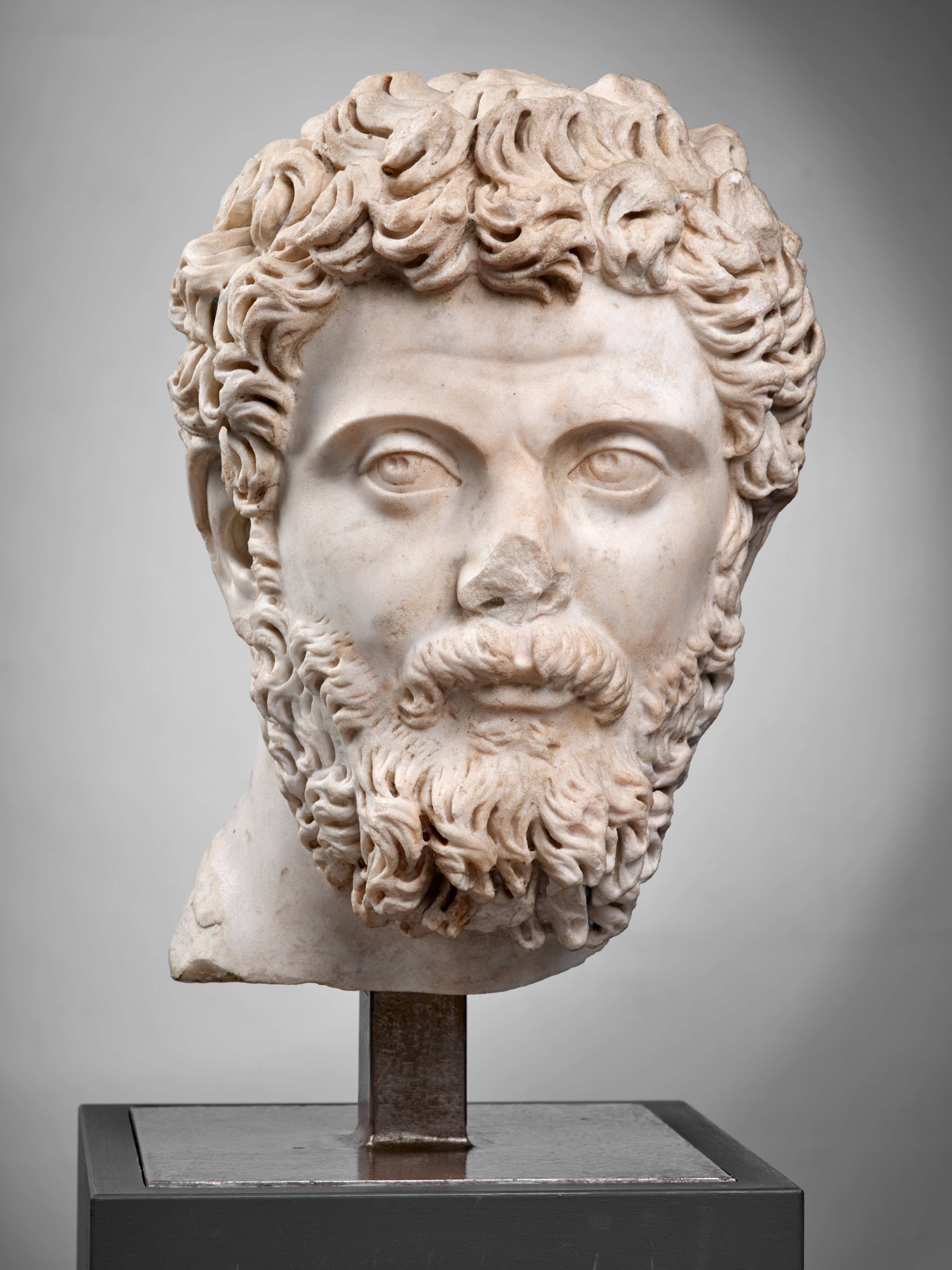 Cette tête de grande qualité, conçue dans un atelier officiel de Rome, date de cette accession au pouvoir, en 193. Cette année fut riche en rebondissements d’ordre politique. Le 28 mars, Pertinax fut assassiné, après seulement quatre-vingt-sept jours de règne. Cet événement ouvre une période de troubles, analogue à celle que l’Empire avait connue en 69, après la liquidation de Néron. À Rome même, le jour de la mort de Pertinax, Didius Julianus fut proclamé empereur par les prétoriens et par le Sénat ; mais, dès le 9 avril, les légions de Pannonie supérieure élevèrent le gouverneur de la province, Septime Sévère, à la dignité impériale et, deux mois plus tard, ce dernier était à Rome où le Sénat avait fini par le reconnaître et où Didius Julianus venait d’être assassiné. En Orient, le gouverneur de Syrie, Pescennius Niger, avait, lui aussi, reçu de ses troupes le titre d’Augustus, dès avril 193, et s’était mis en route vers Rome. Sévère se porta à sa rencontre, le défit près de Cyzique (sur la côte méridionale de la mer de Marmara, ancienne Propontide) puis revint à Rome où l’attendait l’annonce d’une nouvelle rébellion, celle de Clodius Albinus, le gouverneur de Bretagne, qu’il avait cependant désigné comme Caesar en avril 193 et avec qui il avait partagé le consulat en 194. Déclaré ennemi public (hostis) en décembre 195, Albinus fut battu à Lyon en février 197 et tué dans sa fuite.
