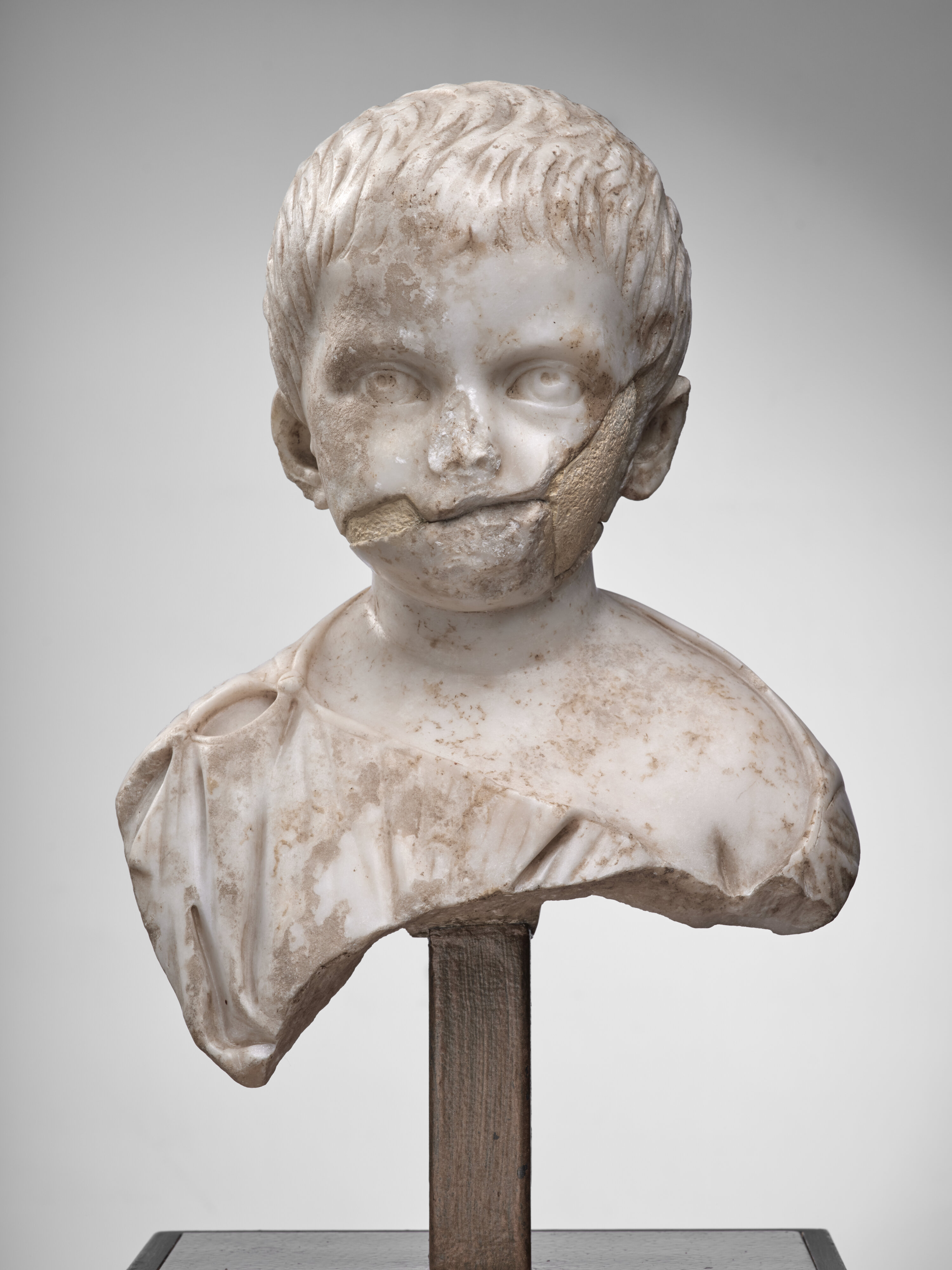 Ce beau portrait a malheureusement été très endommagé, brisé horizontalement, au niveau de la bouche. Les deux parties sont aujourd’hui rassemblées par un comblement. Bout du nez, menton et joue gauche ont disparu.