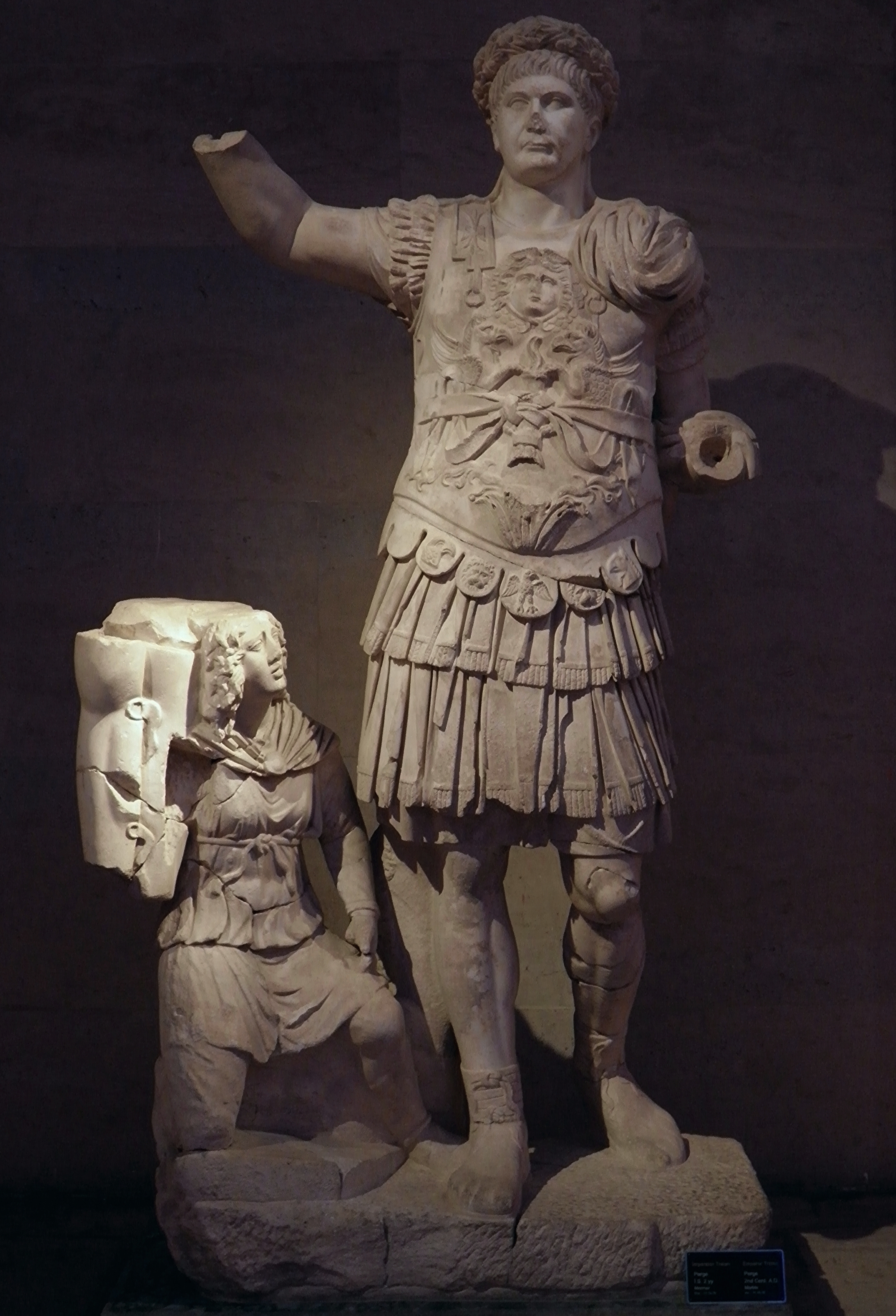 Les pieds dénudés de l’empereur auquel l’individu au bonnet était symboliquement liée, sur l’œuvre de Chiragan, renvoient à un contexte sacré et triomphal, peut-être à un portrait posthume K. Fittschen, ; « Zur Panzerstatue in Cherchel », Jahrbuch des Deutschen Archäologischen Instituts, 91, 1976, p. 175‑210 ; , en partic. p. 207-208.. L’association d’un empereur à un captif dans la statuaire impériale monumentale est connue. Suite à la conquête de la Dacie et à l’organisation de la nouvelle province, le règne de Trajan représente probablement un apogée dans le domaine de l’iconographie triomphale et donc de la citation récurrente du « barbare » ; une véritable « obsession », comme le souligne Lucrezia Ungaro L. Ungaro, ; « Simboli e immagini del trionfo in marmo. « barbari », romani e congeries armorum nel Foro di Traiano », ; Traiano : costruire l’Impero, creare l’Europa [exposition, 29 novembre 2017-16 septembre 2018, Rome, Mercati di Traiano – Museo dei Fori Imperiali, Rome, 2017], Rome, 2017 ; , p. 291.. On citera la