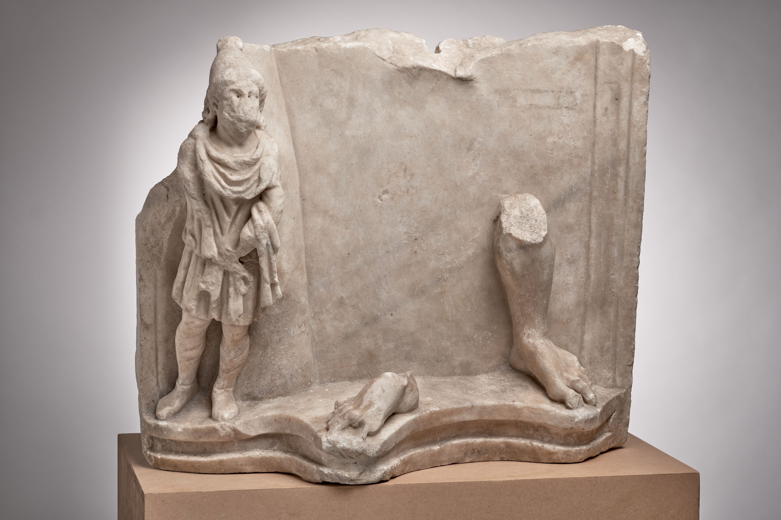 Un personnage masculin est vêtu d’une tunique courte et d’un manteau, chaussé de braies, coiffé d’un bonnet mou à la pointe retombant vers l’avant, communément nommé phrygien. Il se tient au pied d’un arbre dont on aperçoit le tronc, derrière lui. Près de celui-ci, d’un personnage bien plus grand ne subsistent qu’une jambe et les pieds nus. Léon Joulin reconnut ici Mithra au pied du dieu Sol L. Joulin, ; Les établissements gallo-romains de la plaine de Martres-Tolosane (Mémoires présentés par divers savants à l’Académie des inscriptions et belles-lettres »,), Paris, 1901 ; , p. 103., ce que n’écarte pas Espérandieu, qui émet l’hypothèse d’une œuvre créée dans un contexte « mithriaque » É. Espérandieu, ; Recueil général des bas-reliefs de la Gaule romaine, 2. Aquitaine, Paris, 1908 ; , 55-56.. De son côté, Daniel Cazes préféra voir une représentation du dieu Attis, en raison du pedum (bâton) que la figure semblait tenir de ses deux mains D. Cazes, ; Marbres Cachés : Sculptures Antiques Des Réserves Du Musée Saint-Raymond : Exposition Au Musée Saint-Raymond, Musée Des Antiques de Toulouse, Du 20 Juin Au 16 Septembre 2001, S. l, 2001 ; , p. 16-17.. Je ne reconnais ni l’un ni l’autre et privilégierais sans trop de doute un captif, oriental en l’occurrence, sinon la personnification d’une province conquise, au pied d’un empereur. C’est donc bien une iconographie de type triomphal qui semble s’imposer sur ce relief. Sans doute le format réduit a-t-il trompé quelque peu nos prédécesseurs. Nous sommes en effet ici bien loin de la monumentalité attendue pour une telle iconographie, généralement dévolue à de grands espaces publics, sanctuaire ou forum, par exemple L. Ungaro, ; I marmi colorati della Roma imperiale : [exposition Rome, Mercati di Traiano, 28 septembre 2002 - 19 janvier 2003], Venise, 2002 ; , 129-133. ; L. Ungaro, ; « Simboli e immagini del trionfo in marmo. « barbari », romani e congeries armorum nel Foro di Traiano », ; Traiano : costruire l’Impero, creare l’Europa [exposition, 29 novembre 2017-16 septembre 2018, Rome, Mercati di Traiano – Museo dei Fori Imperiali, Rome, 2017], Rome, 2017 ; , 291-296. ; L. Ungaro, V. Di Cola, ; « Sculture dal Foro di Traiano: nuovi approcci metodologici », Archeologia e Calcolatori, 33, 2, 2022, p. 255‑278.. L’image du captif habillé à l’orientale, mains réunies à l’avant (qu’elles aient été maintenues par des liens ou bien qu’elles tiennent un instrument symbole de servitude) se retrouve cependant, certes rarement, en dehors de tels contextes monumentaux. Un pied de table anthropomorphisé de Pompéi, provenant de la Maison du Camille (Naples, Musée Archéologique national, inv. 120403), notamment, offre un parallèle intéressant à notre figure R.M. Schneider, ; « The Barbarian in Roman Art. A Counter-Model of Roman Identity », ; B. Luiselli, P. Pensabene (éd.), The Roman Period (in the Provinces and Barbaric World). XIII International Congress of Prehistoric and Protohistoric Sciences, Forlì, Italie, 8-14 Septembre 1996 (The Colloquia of the XIII International Congress of Prehistoric and Protohistoric Sciences), Forlì, 1996, p. 19‑30 ; , 22. ; G. Pugliese Carratelli (éd.), ; Pompei : pitture e mosaici , Volume VIII : Regio VIII ; Regio IX, parte I (Pompei), Rome, 1998 ; , p. 540-564.. D’un tout autre autre format, des figures colossales obéissant à un type similaire furent également associés à des architectures dont ils pouvaient former de pseudo-supports. On pensera notamment aux productions d’époque antonine, qui, outre les célèbres captifs du forum de Trajan à Rome, ponctuaient l’étage supérieur d’une façade de Corinthe, sur le côté nord de l’agora R.M. Schneider, ; Bunte Barbaren. Orientalenstatuen aus farbigem Marmor in der römischen Repräsentationskunst, Worms, 1986 ; , 128-129..