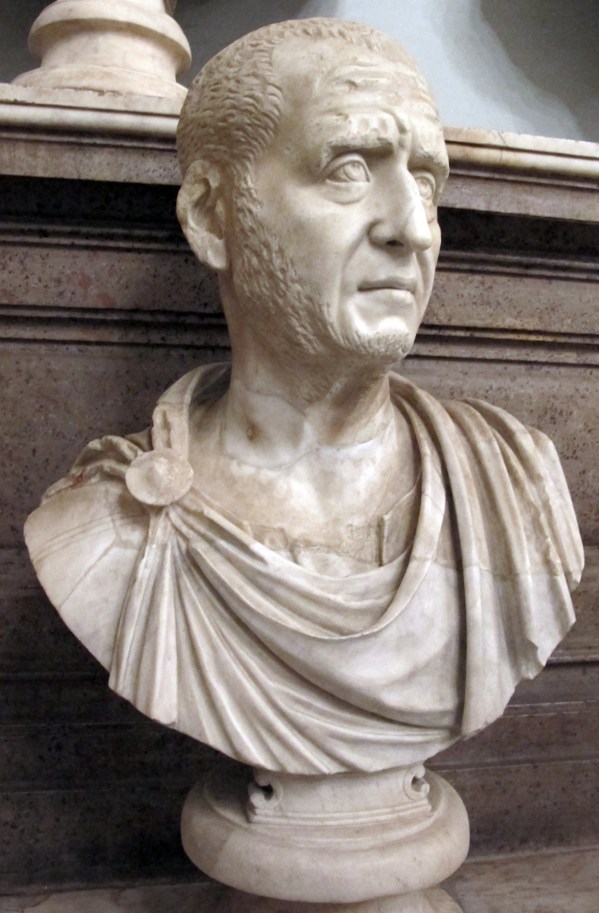 Dèce, on en viendrait presque à se demander s’il ne pourrait s’agir d’un portrait de l’empereur antérieur de quelques années à la proclamation par les troupes de Pannonie en 249. Il faut pourtant se garder de toute proposition d’identification hâtive et simplement constater, une fois de plus, que l’on a là l’image d’un de ces fonctionnaires de l’entourage immédiat de l’empereur, ce qui, dans le contexte de Chiragan, ne surprendra guère.