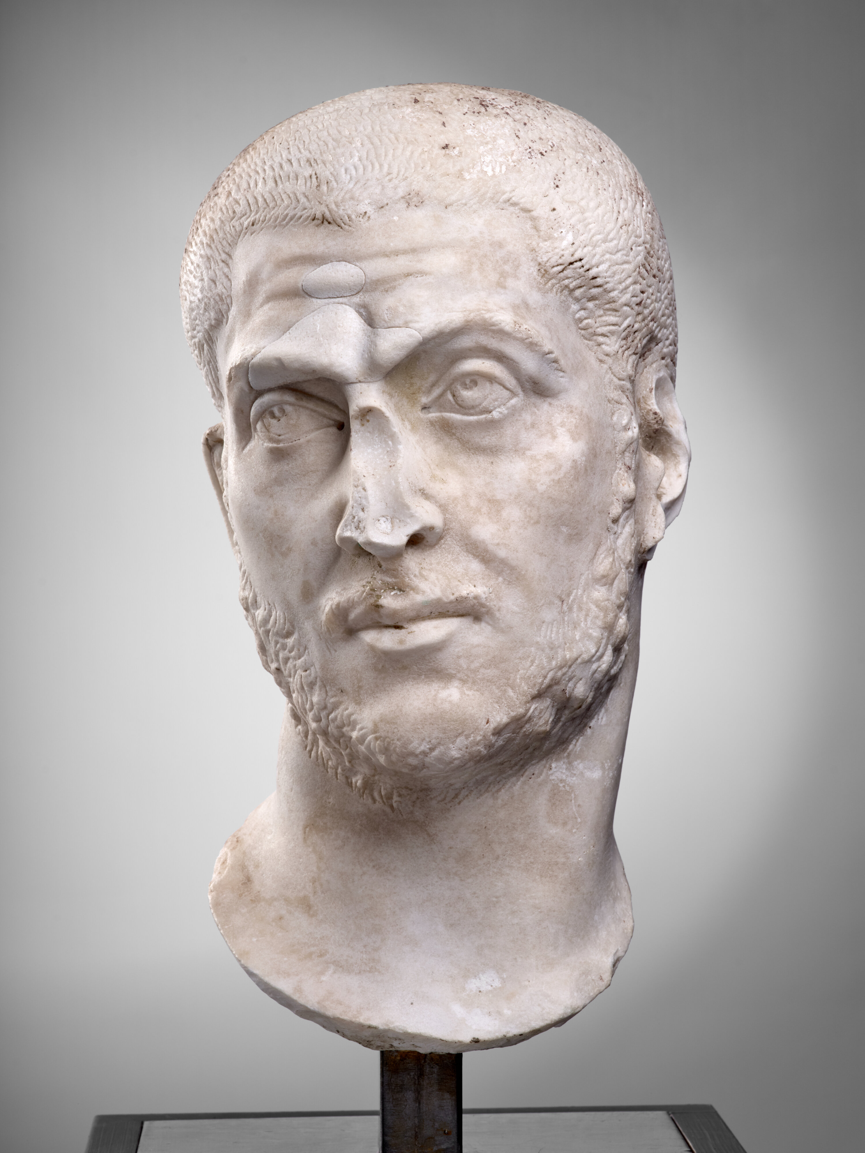 L’inquiétude du regard et les rides d’expression profondément creusées expriment le nouveau tournant pris par l’art du portrait romain en cette période de crises (gouvernementale, économique, financière et sociale) et d’interrogations. On a anciennement reconnu ici Volusien, empereur de 251 à 253.