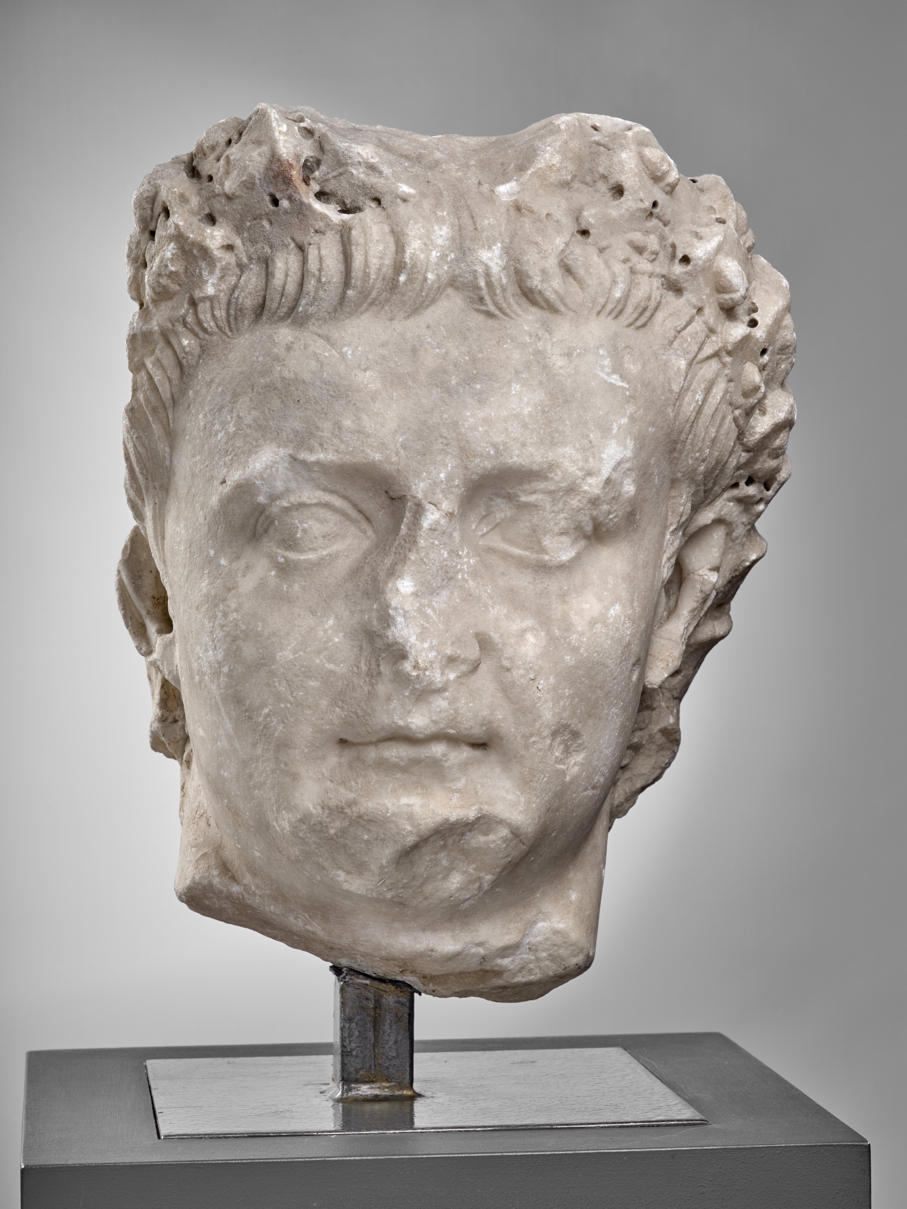Une partie de la couronne de la tête du musée Saint-Raymond fut probablement brisée dès l’origine, peut-être lors de l’exécution des feuilles de chêne, opération très délicate pour le sculpteur. Ainsi s’explique la grande mortaise, située sur le côté droit, qui correspond à une réparation et à l’insertion d’une prothèse. C’est un pareil accident qui explique le creusement du