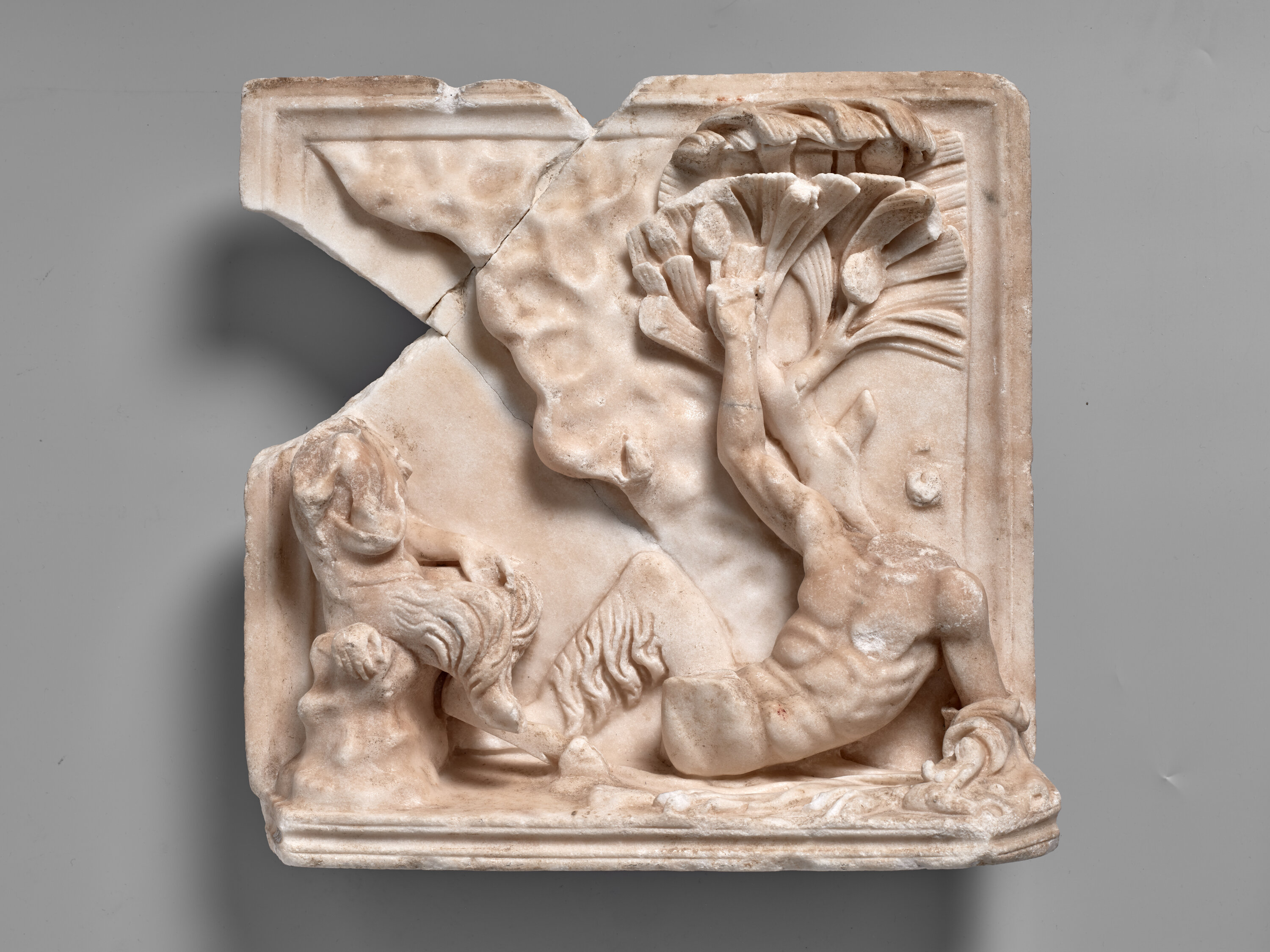 Outre le tableau de l’enlèvement de Perséphone, qui correspond à une catégorie d’œuvre très rare, un second pinax de marbre provient, lui aussi, de la villa. Il représente deux satyres, masculin et féminin, reconnaissables, au premier regard, à leurs pattes de boucs. La scène se déroule devant une grotte, au pied d’un pin pinier (pinus pinea) ou pin parasol. La créature de droite, couchée, prend appui sur son bras gauche, autour duquel est enroulée la pardalide (peau de panthère). Il tend le bras en direction de l’une des trois pommes de pin (strobilos) visibles dans l’arbre. Le satyre féminin lui fait face ; plus petite, elle est assise sur un rocher, le corps enveloppé dans sa peau de bouc, dont l’une des pattes retombe au-devant de l’épaule gauche. Les créatures sont malheureusement acéphales. Ne reste que la trace d’un tenon, à droite, vestige de la liaison de la tête de la créature couchée avec la surface du tableautin. À ces décapitations, s’ajoutent d’autres lacunes : jambe gauche du satyre ou encore bras et jambe du côté droit de la satyresse, également brisés. Enfin, comparant ce relief au tableau montrant Hadès et Perséphone, on constate ici quelques maladresses de proportions et peut-être une plus grande hâte dans l’exécution.