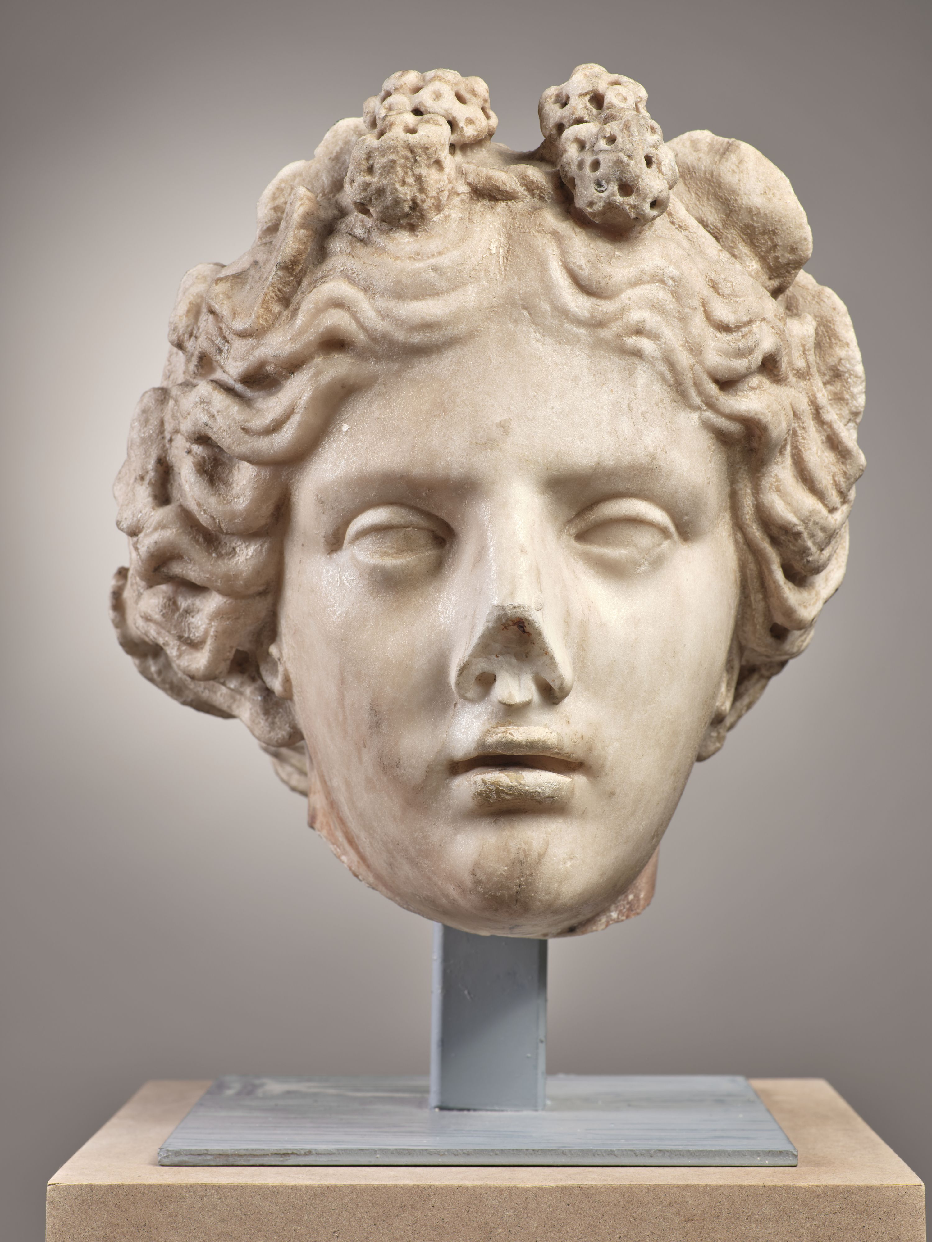 Capus P., "Tête de Dionysos", dans Les sculptures de la villa romaine de Chiragan, Toulouse, 2019, en ligne <https://villachiragan-apercu.studi-o.dev/ark:/87276/a_Ra_53_(1)>.
