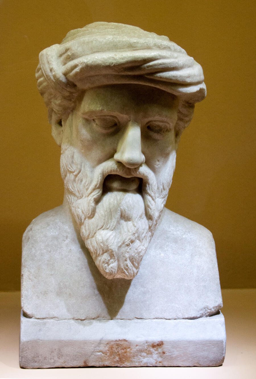 tête en hermès des Musées du Capitole, devenue canonique et conventionnellement identifiée comme un portrait du philosophe, pourrait fournir quelques points communs avec notre œuvre, tant par le type de support que par la longue barbe effilée. Cependant, le bandeau devient ici turban tandis que la chevelure semble loin de la sophistication des longues boucles, retombant sur les épaules, caractéristiques de la figure engainée de Chiragan. Sur ce dernier point,