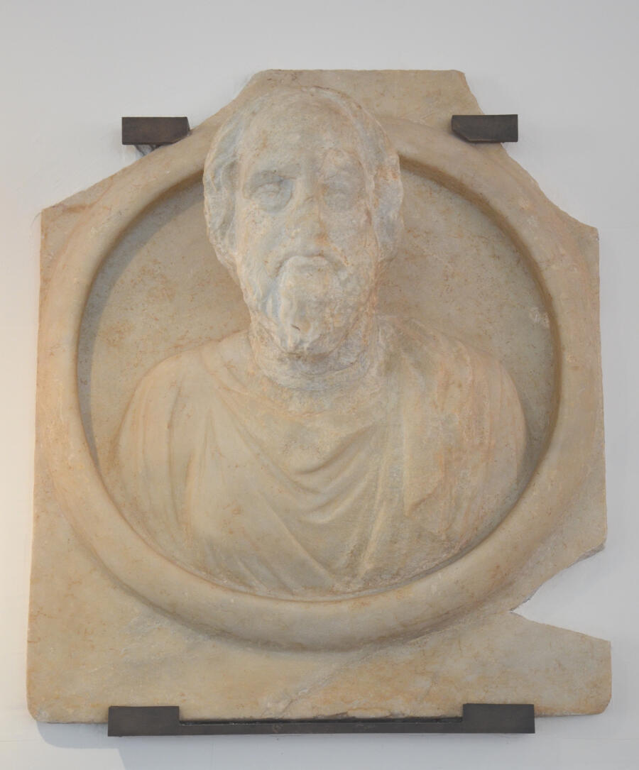 La présence de philosophes au sein des villas est un phénomène connu. Socrate, père fondateur de la philosophie, au même titre qu’Aristote, apparaissait dans le cadre privé ou semi-public des résidences romaines au moins dès le début de l’Empire (missing reference). Maintenir leur image à la fin de l’Antiquité ne doit pas nous étonner, malgré la rareté des exemplaires découverts. Comme nous l’avons mentionné plus haut à propos de Pythagore, plusieurs figures sur boucliers à Aphrodisias, au sein d’un édifice qui semble être un lieu d’enseignement destiné à une élite, représentaient de grands penseurs de l’Antiquité classique mais également tardive R.R.R. Smith, ; « Late Roman Philosopher Portraits from Aphrodisias », The Journal of Roman Studies, 80, 1990, p. 127‑155 ; , en partic. p. 127-155.. C’est également sous forme d’hermès que l’on présentait les portraits des philosophes, dans les jardins ou les péristyles, encore des siècles plus tard, comme le prouve le relief de Chiragan. Le portrait en hermès entretenait un lien avec le dieu dont il prit le nom, ce voyageur et messager, fils de Zeus et de Maïa, en particulier en raison de sa fonction de diffuseur de la parole (Hermès _Logios*) S. Dillon, ; Ancient Greek Portrait Sculpture : Contexts, Subjetcs and Styles, Cambridge, 2006 ; , p. 31.. Autre demeure et nouvel exemple, la