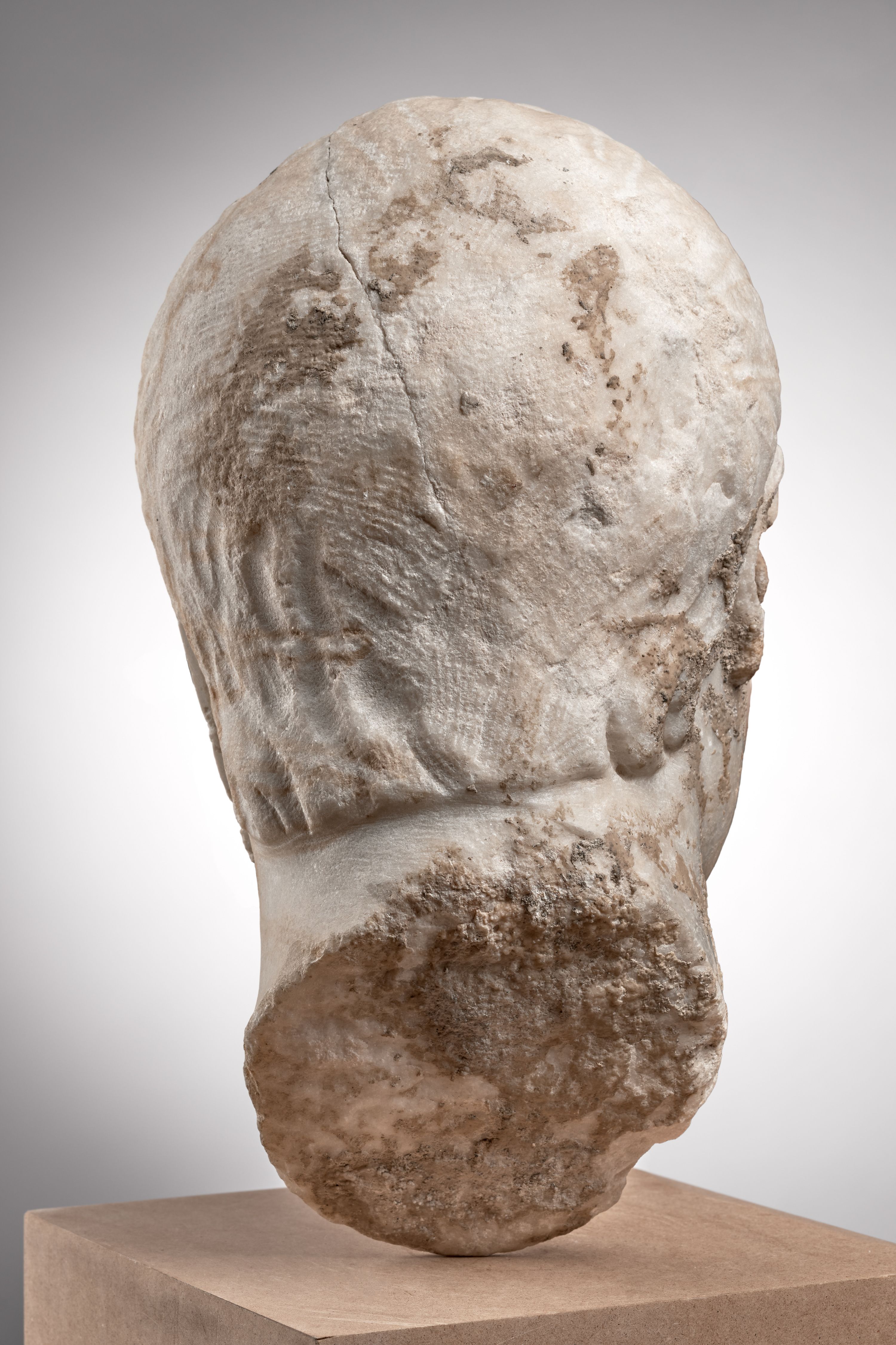 Avec les deux autres têtes masculines en ronde bosse de cette série d’effigies, cette tête partage un même mouvement en vagues successives, déferlant de l’arrière vers l’avant, et un même dessin des mèches de la chevelure, un même rendu de l’épiderme ainsi qu’un modelé très détaillé du pavillon de l’oreille.