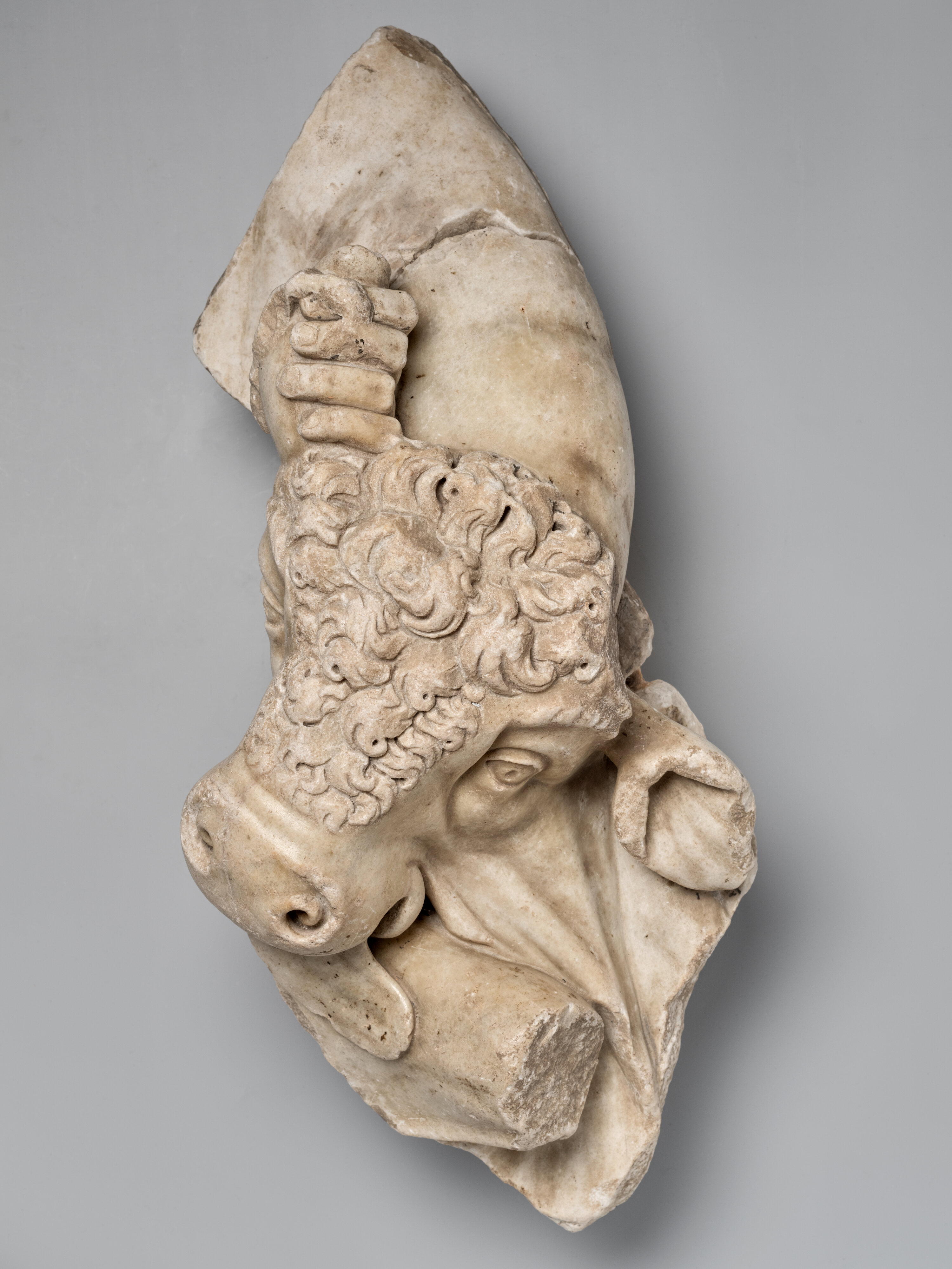 S’il ne subsiste, du grand relief originel, qu’un seul fragment identifiable, celui-ci est de très grande qualité. Tandis que d’une main, Hercule saisit l’une des cornes, il enserre de son bras le cou de l’animal dont la langue pendante exprime bien l’agonie.