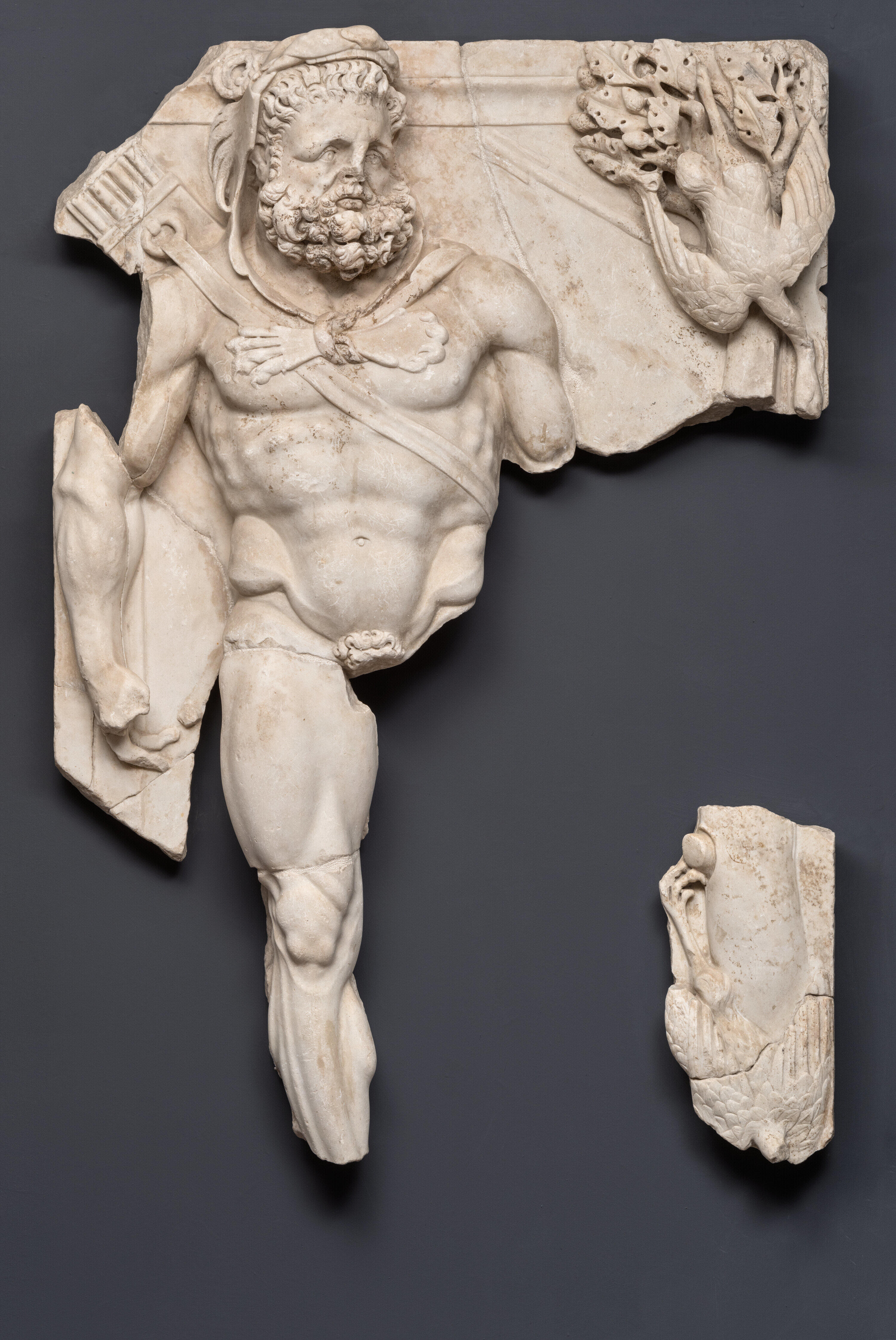 Sur le relief, Hercule, le carquois rempli de flèches dans le dos, regarde les oiseaux tomber. En haut à droite, un oiseau, transpercé d’une flèche, chute d’un arbre ; un second est à terre. De très fortes similitudes ont été remarquées entre les ailes et les griffes impressionnantes des oiseaux de ce panneau et celles d’un aigle mort sur un relief représentant le mythe de Prométhée, à Aphrodisias M. Bergmann, ; Chiragan, Aphrodisias, Konstantinopel : zur mythologischen Skulptur der Spätantike (Palilia), Wiesbaden, 1999 ; , p. 62.. Ces détails rendent probants les liens avec les ateliers de Carie. Quant à Hercule lui-même, son corps est ici le plus emprunté du cycle, marqué par une sorte d’engourdissement que l’écartement du bras droit ne fait qu’accentuer. L’hypertrophie musculaire participe, bien évidemment, de cette raideur, par le fort développement de la cage thoracique, des pectoraux, des obliques, du grand droit de l’abdomen, du bourrelet inguinal géométrique et de l’accentuation, au-dessus de la rotule, du vaste interne du quadriceps qui forme un losange et des lignes aiguës. De tels schémas se retrouvent en Carie, et particulièrement à