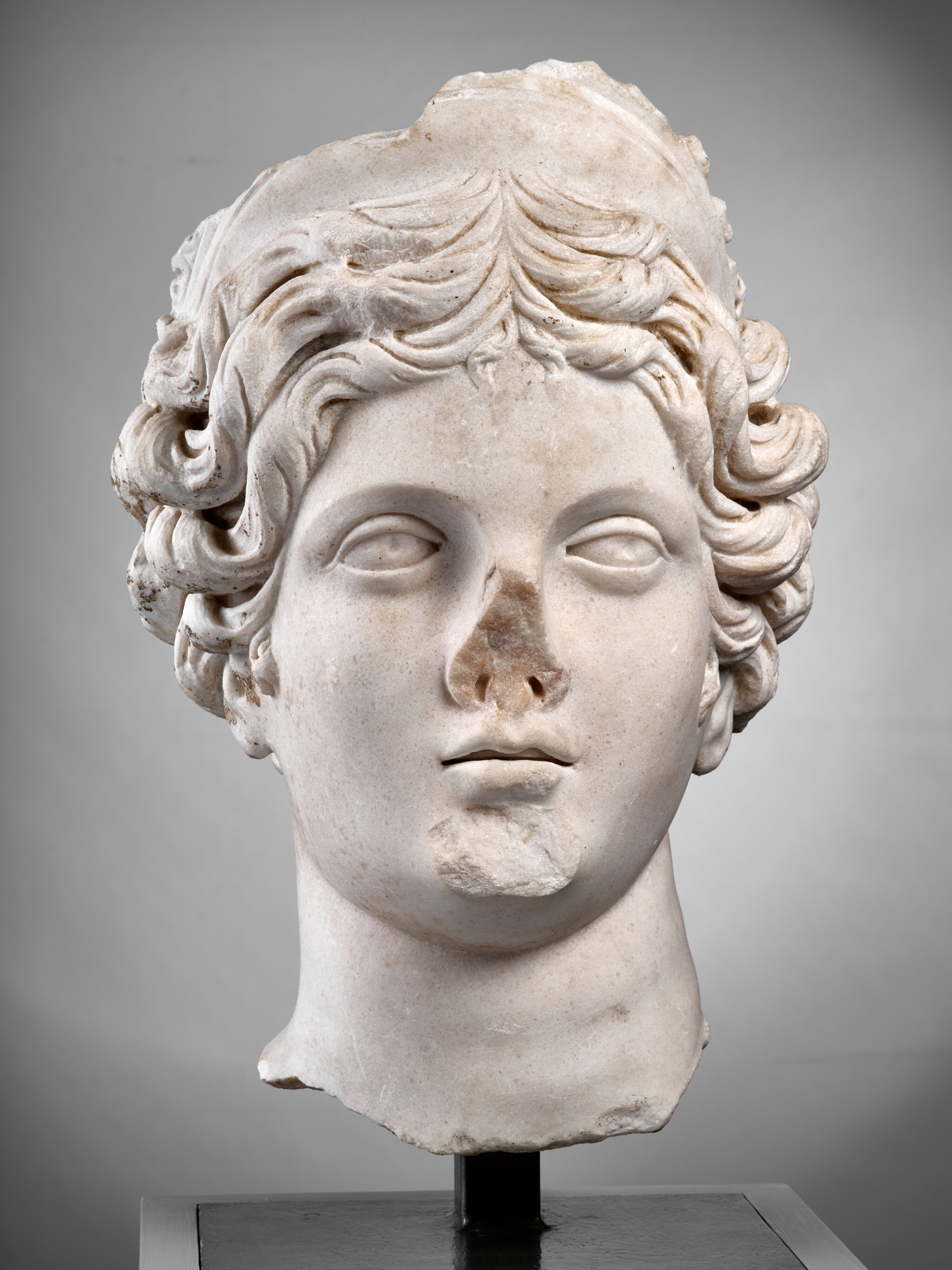 Cette tête féminine pourrait représenter Vénus (l’Aphrodite grecque), déesse du charme, de l’envoûtement et de l’amour. L’attachement particulier qu’entretint Rome à son encontre est intimement lié à son statut de mère d’Enée, ancêtre mythique du peuple romain.