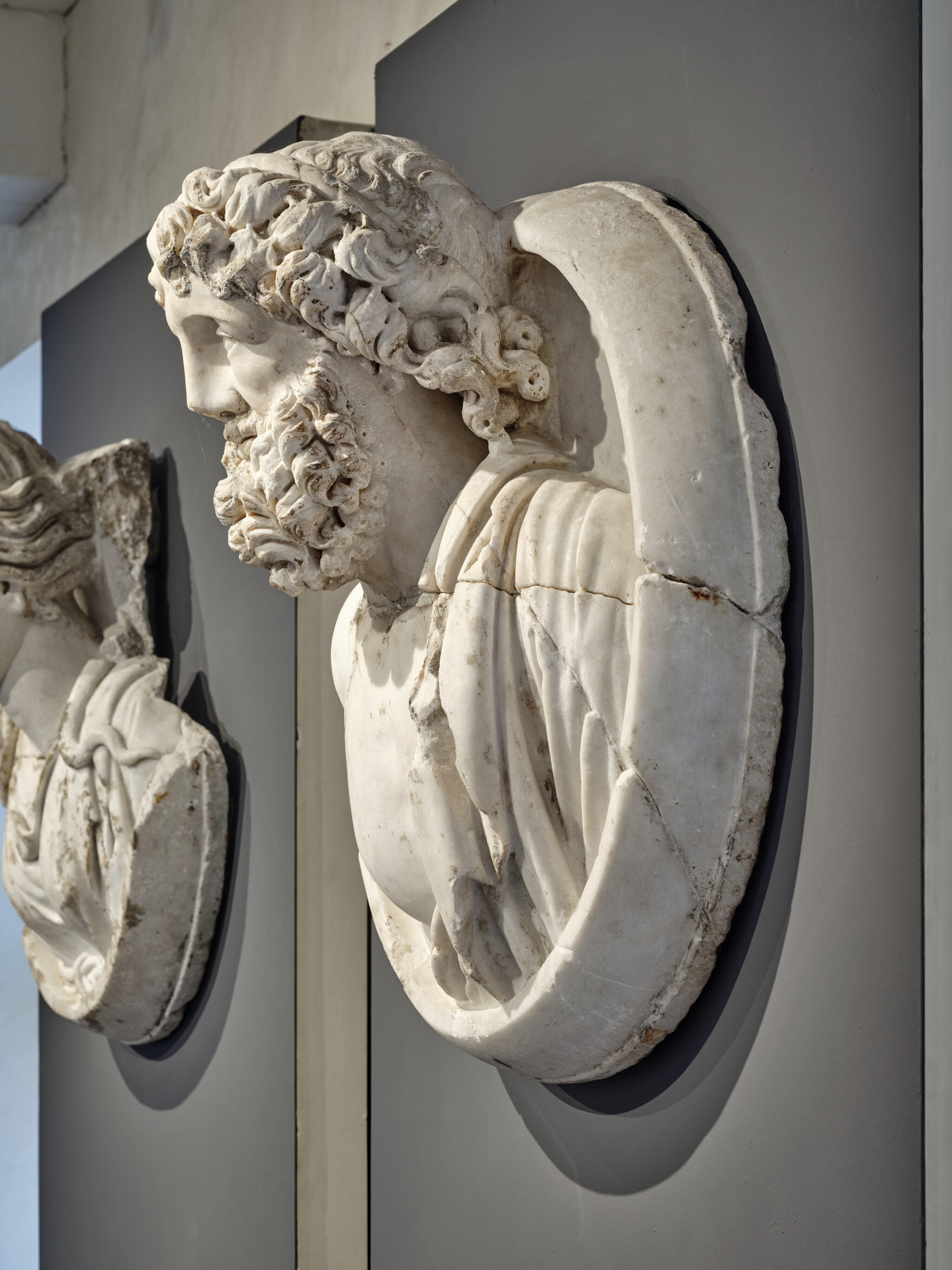 Les yeux d’Esculape, saillants et couverts en partie par de larges paupières supérieures tombantes, sont couronnés d’arcades sourcilières à angle aigu. Au-dessus du front, deux grandes boucles sinueuses, parfaitement symétriques, en forme de S, sont disposées de part et d’autre de la division centrale de la chevelure. De longues boucles généreuses couvrent les oreilles ou retombent à l’arrière jusqu’à la nuque. La barbe est encore plus abondante. Divisée verticalement et très profondément, à l’aide du trépan, les enroulements y sont divisés horizontalement au ciseau et s’achèvent à l’avant par deux spirales qui, au niveau de la pomme d’Adam, s’entremêlent. Les autres médaillons figurant des divinités masculines ont reçu un traitement similaire. C’est une caractéristique du travail de l’atelier venu exécuter cette commande de prestige.