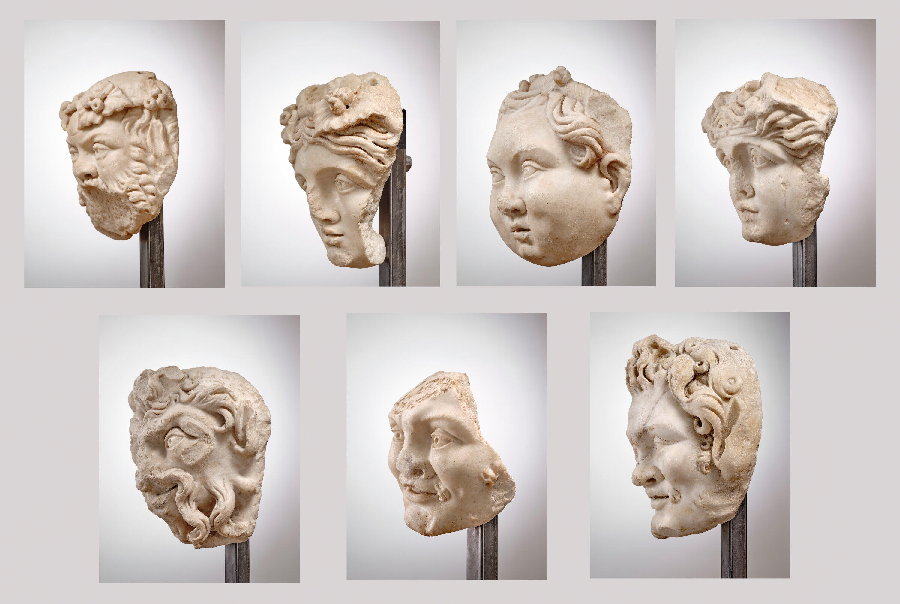 On y reconnaît un silène [1], deux Horae (Saisons) ou peut-être ménades [2, 4], un Bacchus enfant (?) [3], un Pan [5] et deux satyres [6, 7]. Ces têtes de marbre sont parfaitement imaginables sur le mur d’une salle de banquet. Une mosaïque de Volubilis, notamment, décorant le sol du triclinium de la maison « des Travaux d’Hercule », réunit, entre autres, les Saisons aux épreuves du héros gréco-romain (missing reference). Doit-on imaginer un tel rapprochement — marmoréen cette fois-ci — dans un même espace à Chiragan ? L’association de ces demi-dieux est une référence à l’univers de Bacchus (le Dionysos grec). La succession des Saisons symbolise l’éternité et le renouveau permanent, ce que promet également le dieu. Ces _Horae* pourraient être, ici, l’été, couronné d’épis, et le printemps, couronné de boutons de fleur. Ces filles de Zeus et de Thémis (déesse de la justice) ne sont donc en rien contradictoires avec l’univers dionysiaque (ou bachique), au contraire, puisque la mythologie a, par ailleurs, fait de ces gardiennes de l’Olympe, les nourrices du petit Bacchus/Dionysos Nonnos de Panopolis, ; Dionysiaques, 450–470 ; , IX, 11..